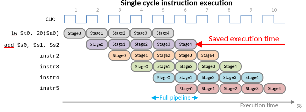 Si on devait poser des instructions exécutées séquentiellement sur une timeline on pourrait se rendre compte que l’on perd temps car chaque phase n’est pas instantanée. Pour ce faire nous pouvons avoir N [[Les processeurs#le-datapath|datapath]] cd qui nous permet de paralléliser les instructions en lançant le prochain cycle d’exécution dès qu’on en démarre un.L’exécution d’instructions
