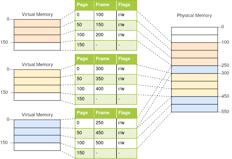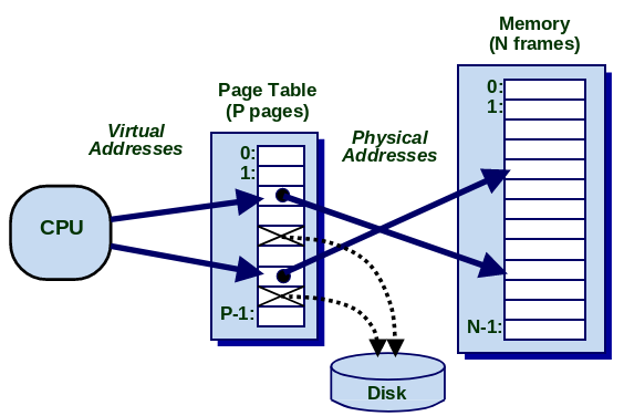 Le disque peut aussi être utilisé dans l’usage de la mémoire virtuelle, quand un processus va s’exécuter il ne va pas accéder directement aux adresses en mémoire, il va passer par des pages qui vont contenir l’adresse mémoire correspondante ou une adresse sur le disque nommé frame. Cet intermédiaire permet facilement de relocaliser les données, de permettre au programmer de ne pas gérer l’espace de mémoire, etc…