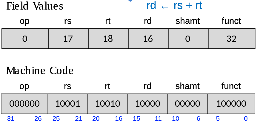 Cette instruction se traduirait en entier sur 32 bits par 0x02328020, en découpant cet entier avec le format MIPS on obtient cette instruction en mémoire