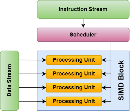 Les processeurs respectant ce type d’architecture produisent des flux d’instructions qui vont être envoyés à des processors units contenant des ALU pour exécuter les instructions du flux en parallèle.